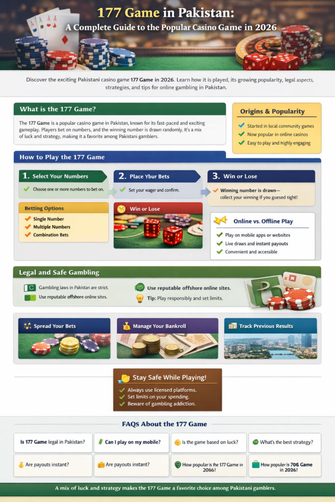 The 177 Game represents a unique aspect of Pakistan’s gambling culture in 2026. Its combination of simplicity, thrill, and accessibility has made it one of the most popular casino games in the country. While legal and responsible considerations are crucial, the game continues to captivate players both offline and online. With technological advancements and growing online communities, 177 Game is set to remain a staple in Pakistan’s online casino landscape for years to come.